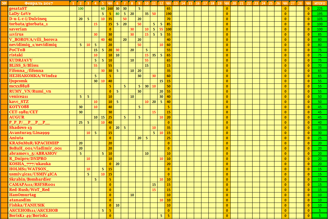 1 место - 50 очков и 20 в репутацию - gtorbata_1 2 место - 30 очков и 15 в репутацию - Wind12 1/2 фин - 20 очков и 5 в репутацию - Fifonna, Dulcineq