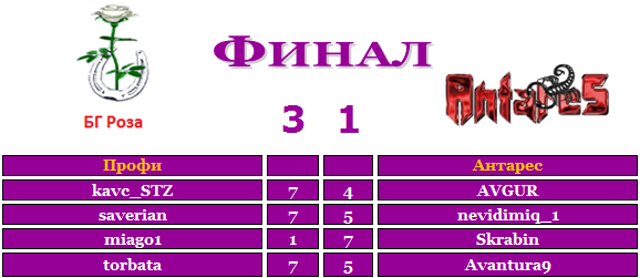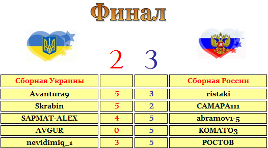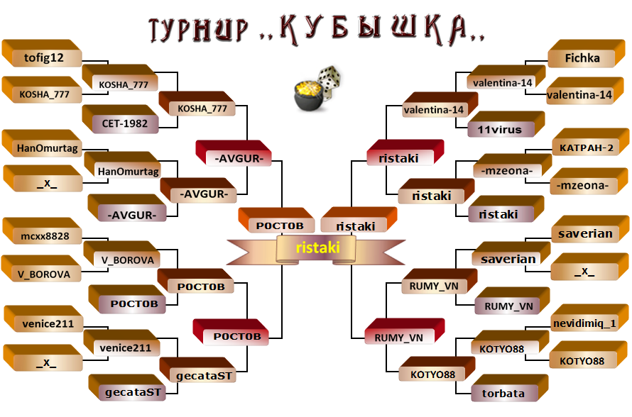 Очки в турнир МНК и в топ игрок 1место по 30оч и по 20 в репутацию abramov/POCTOB 2место по 20оч и по 15 в репутацию KOTYO88/tofig12 1/2 финала по 10оч и по 5 в репутацию V_BOROVA/nevidimiq,venice211/gecataST