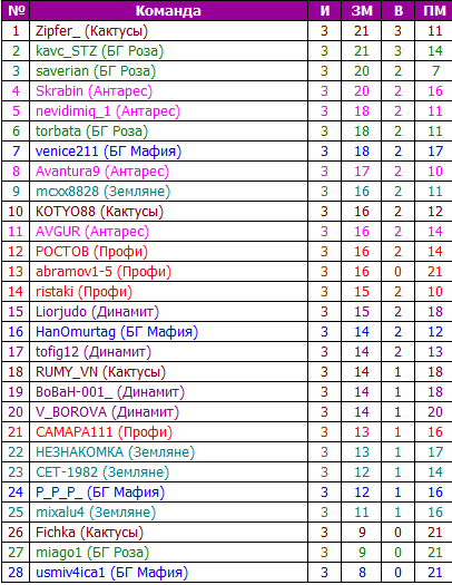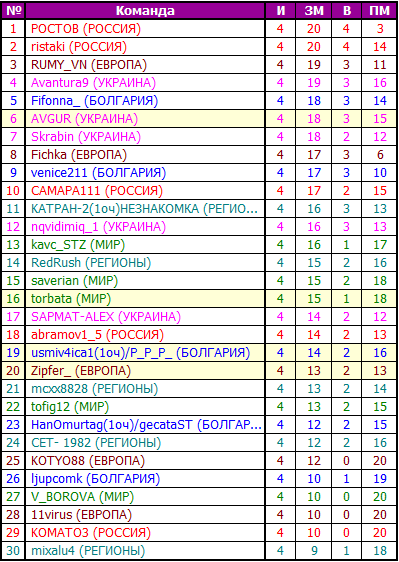 1 место - 50 очков и 20 в репутацию - ristaki 2 место - 30 очков и 15 в репутацию - POCTOB 3 место - 20 очков и 10 в репутацию -AVGUR 4 место - 15 очков и 5 в репутацию -Rumi_vn
