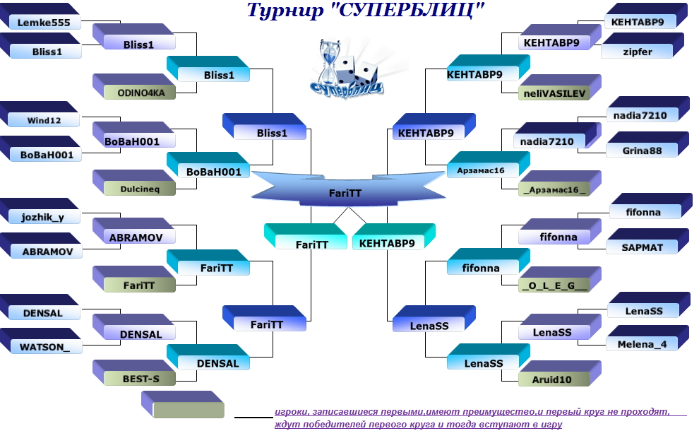 | Турнир "СУПЕРБЛИЦ" . Игры проходят каждый четверг. Начало игры в 20:00 по Москве. В турнире принимают участие первые записавшиеся 8, 16 или 32 игрока.