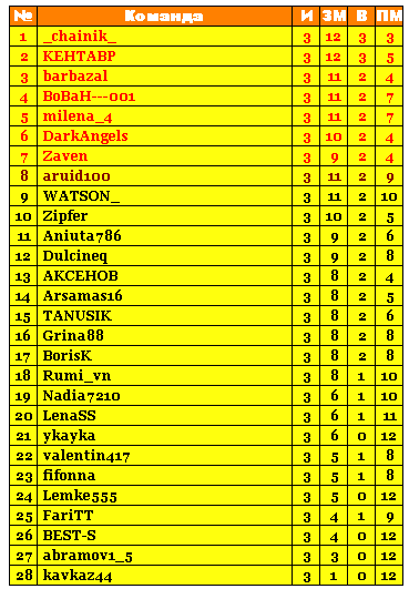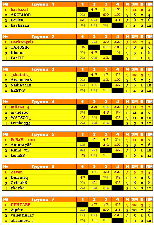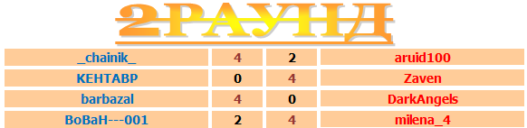 Раунд 2 2а. Игроки, прошедшие во второй раунд ставят столы в комнате Petite4 и будут играть стыковой матч за выход в финальный раунд. Пары 2-ого раунда составляются по принципу : игрок с лучшими показателями 1-ого раунда играет с игроком с худшими показателями 1-ого раунда из числа лучшей восьмерки игроков прошедших во 2-ой раунд (1v8 , 2v7, 3v6, 4v5), при этом игроки, прошедшие во 2-ой раунд из одной группы 1-ого раунда, разводятся по разным парам! [color=red]Матч до 4 с Даве и правилом Кроуфорда Выигравшие у своих соперников проходят в финальный раунд. 2б. Проигравшие игроки получают по 5 очков в раздел "Ночная Рулетка" и 2 балла в репутацию
