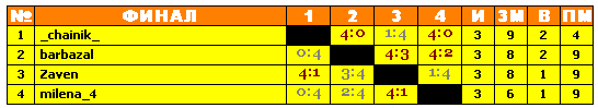 Финальный раунд 3а. Матчи финального этапа проводятся по принципу "каждый с каждым". Матч до 4 с Даве и правилом Кроуфорда Победитель выявляется по следующим показателям и получает очки в раздел Ночная Рулетка. 3б. Наибольшее кол-во очков. 3в. Наибольшее кол-во побед. 3г. Наименьшее кол-во проигранных очков. 3д. Победитель по личной встрече. 3е. При равенстве этих показателей играется 1 партия между игроками и выявляется победитель. 3ж.Победитель получает 50 очков в раздел Ночная Рулетка и медаль в зал славы и 10 оч. в репутацию 2 место - 30 очков и 8 в репутацию 3 место - 20 очков и 6 в репутацию 4 место - 15 очков и 4 в репутацию