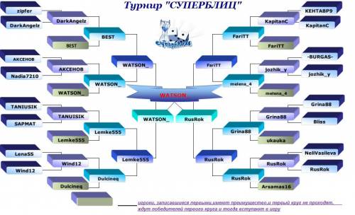 | Турнир "СУПЕРБЛИЦ" . Игры проходят каждый четверг. Начало игры в 20:00 по Москве. В турнире принимают участие первые записавшиеся 8, 16 или 32 игрока.