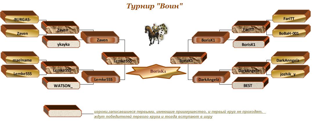 2. СХЕМА ТУРНИРА И ОРГАНИЗАЦИЯ МАТЧЕЙ 2.1. Турнир проводится по таблице 2.2. Матчи Турнира проходят за столами в комнате Petite 3; 2.3. Каждый матч состоит из серии игр до 2 очков; 2.4. Все матчи турнира играются без правила «даве» (без прямого и обратного удвоения); 2.5. Ставка при создании стола 1.49 $. 2.6. В случае отсутствия игрока в течении 10 минут (от начала турнира) ему засчитывается поражение, соперник же проходит в следующий раунд Турнира; 2.7. В случае если во время игры один из соперников по какой-либо причине отключился и не успел вернуться в игру, победа автоматически засчитывается оставшемуся игроку;(по правилам BGroom) 2.8. Результат матча обязательно отписывается в чате на сайте клуба; 2.9. Все жалобы на спорные ситуации в игре будут рассматриваться, только при наличии скринов. 2.10.В случае, если во время игры один из соперников по какой-либо причине отключился и не успел вернуться в игру, победа в прерванной партии автоматически засчитывается сопернику и ему зачисляется от 1 до 2 очков (марс) в засимости от ситуации в прерванной партии а весь матч доигрывается дальше после устранения неполадок в интернете . При вторичном отключении игрока победа автоматически засчитывается сопернику и его счет пополняется до 2 очков, Отключившемуся игроку присваивается то количество очков, которое он успел «заработать» 2.11. В финале количество игр увеличивается до 3-х игр без удвоения.