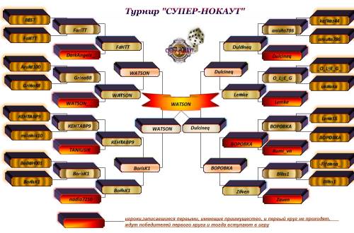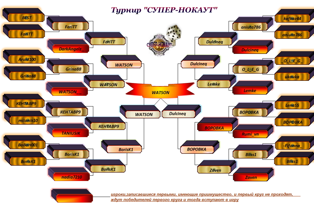 | Турнир "СУПЕР - НОКАУТ " Игра пройдёт в комнате Petite 4, ставка 1.49$ до 7 с даве с правилом кроуфорда, финал до 9 с даве с правилом кроуфорда. Время назначается ведущим.