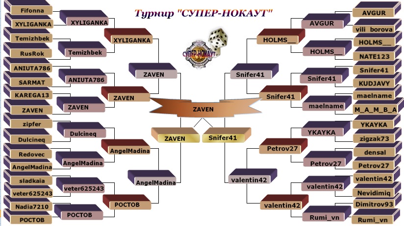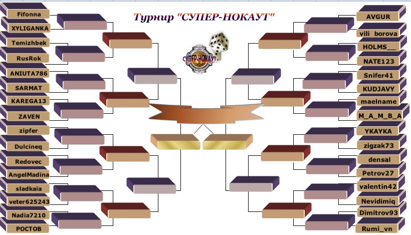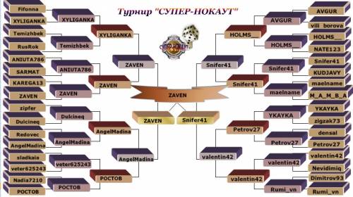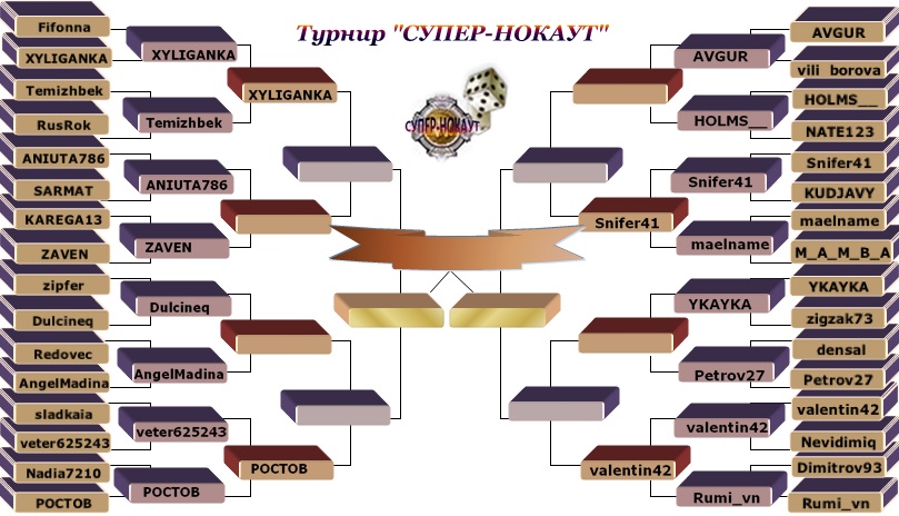 | Турнир "СУПЕР - НОКАУТ " Игра пройдёт в комнате Petite 4, ставка 1.49$ до 7 с даве с правилом кроуфорда, финал до 9 с даве с правилом кроуфорда. Время назначается ведущим. ВРЕМЯ ИГРЫ В ТУРНИРЕ ТОЛЬКО БЛИЦ! Если игрок не переустанавливает время и не начинает игру ,то он получает тех поражение.,но если игра началась то претензии не приниснимаются и игра доигрывается с тем временем ,которое стоит в игре. Игра проходит по таблице, которая будет выложена на форуме клуба. Проигравший игрок выбывает и покидает турнир, выигравший ставит стол и продолжает игру.