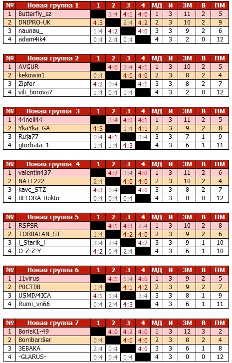 1.4. Места в группах и объединенной таблице определяются следующими показателями: 1) Наибольшее кол-во очков. 2) Наибольшее кол-во побед. 3) Наименьшее кол-во проигранных очков. 4) Личная встреча в группе. 5) В объединенной таблице при равенстве всех показателей и отсутствии личной встречи при необходимости играется дополнительный матч до 1 очка, но только, если это имеет турнирное значение. 1.5. В общей таблице победители групп помещены вверх таблицы и не могут быть ниже игроков, занявших вторые места. 1.6. Обозначения в таблице: ЗМ - Заработанные в матчах очки В - общее количество Побед в матчах ПМ - Проигранные в матчах очки МД - в объединенной таблице показывает Место в группе