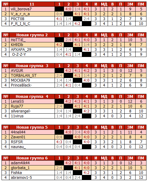 1.4. Места в группах и объединенной таблице определяются следующими показателями: 1) Наибольшее кол-во очков. 2) Наибольшее кол-во побед. 3) Наименьшее кол-во проигранных очков. 4) Личная встреча в группе. 5) В объединенной таблице при равенстве всех показателей и отсутствии личной встречи при необходимости играется дополнительный матч до 1 очка, но только, если это имеет турнирное значение. 1.5. В общей таблице победители групп помещены вверх таблицы и не могут быть ниже игроков, занявших вторые места. 1.6. Обозначения в таблице: ЗМ - Заработанные в матчах очки В - общее количество Побед в матчах ПМ - Проигранные в матчах очки МД - в объединенной таблице показывает Место в группе