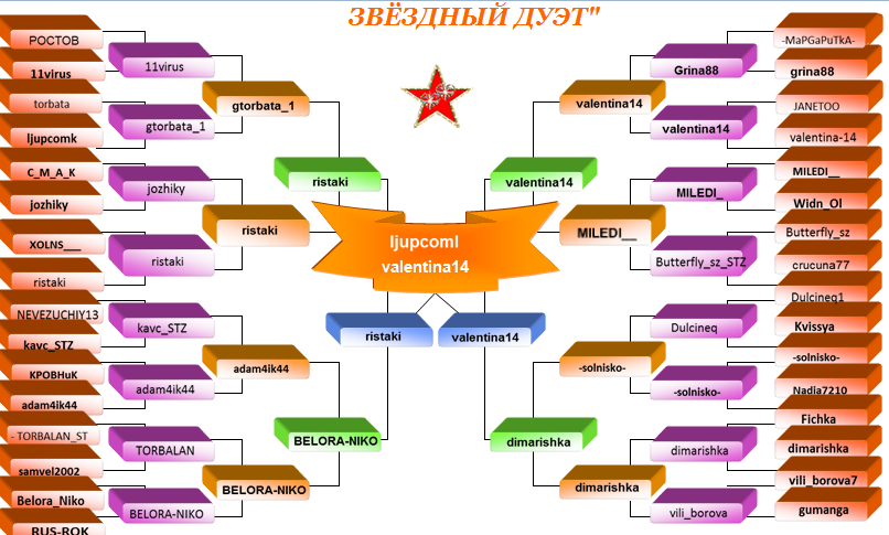 В турнире принимают участие пары ОН и ОНА. Игра проходит по выложенной таблице на сайте. Девушки занимают места в левом крыле таблицы мужчины справа и начинают двигаться на встречу друг другу. До финала достаточно добраться одному из партнёров. В финале пары играют между собой по две игры и выявляют победителя. Если в финал попадает пара заявленная изначально то она становится супер ЗВЁЗДНЫЙ ДУЭТ и выигрывает турнир безфинальных игр. Победители награждаются кубками в зале славы.