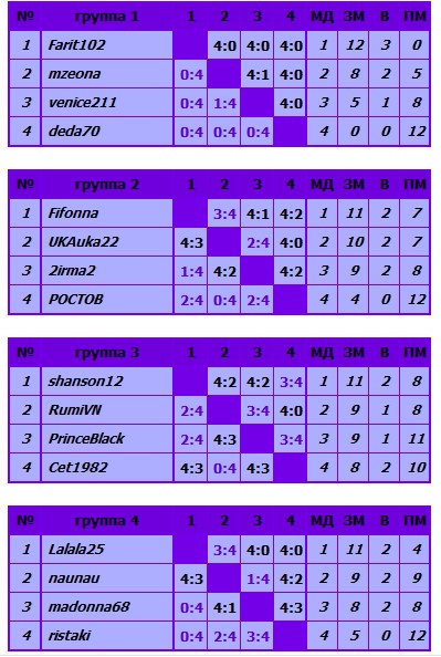 Если во время турнира игрок понял ,что ему не светит ничего ,бросает играть или сдаёт партии ,то он не принимает участия вследующем турнире.Если тот же игрок будет замечен вторично ,то он лишается права играть в данном турнире на месяц.В третий раз навсегда турнир НР. будет для него закрыт! Уважайте работу ведущих и тех кто играл ,не наказывайте других игроков даря ХАЛЯВНЫЕ очки ! Играйте честно! пожалуйста. 1. "Раунд 1" 1.1. Играют первые записавшиеся 16, 20, 24, 28 или 32 участников,они разбиваются на 4, 5, 6, 7 или 8 групп по 4 игрока. 1.2. Матчи в группах проводятся по принципу "каждый с каждым".Матч до 4 с Даве и правилом Кроуфорда. 1.3. В финальный раунд проходят: 1.3.1. 8 игроков (когда менее 20 игроков): победители групп и лучшие из числа занявших 2ые места в группах; все играют со стадии 1/4 финала. 1.3.2. 12 игроков (когда играет свыше 20 игроков): победители групп и лучшие из числа занявших 2ые места в группах; при этом четыре победителя групп с лучшими показателями проходят в 1/4 финала напрямую, остальные играют со стадии 1/8 финала.
