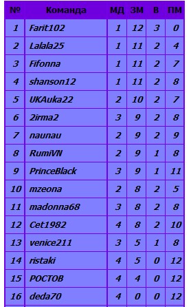 1.4. Места в группах и объединенной таблице определяются следующими показателями: 1) Наибольшее кол-во очков. 2) Наибольшее кол-во побед. 3) Наименьшее кол-во проигранных очков. 4) Личная встреча в группе. 5) В объединенной таблице при равенстве всех показателей и отсутствии личной встречи при необходимости играется дополнительный матч до 1 очка, но только, если это имеет турнирное значение. 1.5. В общей таблице победители групп помещены вверх таблицы и не могут быть ниже игроков, занявших вторые места. 1.6. Обозначения в таблице: ЗМ - Заработанные в матчах очки В - общее количество Побед в матчах ПМ - Проигранные в матчах очки МД - в объединенной таблице показывает Место в группе