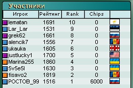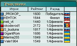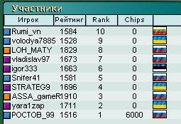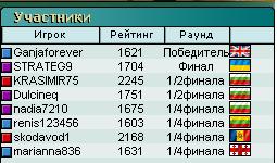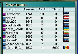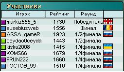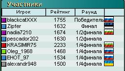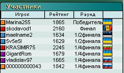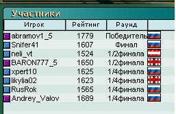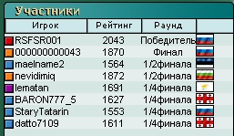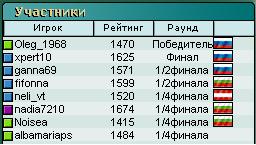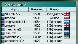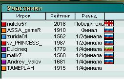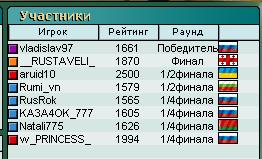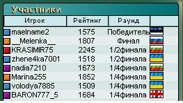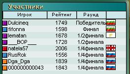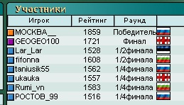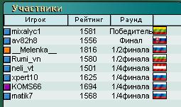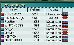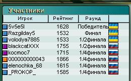 1. Звание "Чемпион" разыгрывается в трёх дисциплинах: "НОКАУТ", "СВИНГ", "КОМБИНАЦИЯ" (СВИНГ+НОКАУТ). 2. Чтобы побороться за звание «ЧЕМПИОН» необходимо стабильно и успешно играть в турнирах "ЧЕМПИОН" в НОКАУТ или СВИНГ или том и другом. 3. Турниры "Чемпион" проводятся в будние дни (с понедельника по пятницу) в строго определенное время: НОКАУТ в 20-00, СВИНГ в 22-00. 4. Запись в турнир не ведётся; количество игроков неограниченно; в случае если количество игроков будет превышать один турнир,то будет проведен дополнительный турнир в след за первым (например: НОКАУТ 1-й турнир 20-00, второй 20-05; СВИНГ 22-00, 22-05). 5. Игрок в течение одного дня имеет право принять участие только в одном турнире "ЧЕМПИОН" СВИНГ и в одном турнире "ЧЕМПИОН" НОКАУТ. 6. По результатам турниров "ЧЕМПИОН" игрокам начисляются зачётные баллы: 6.1. НОКАУТ: +50 = победитель +25 = финалист +10 = полуфиналисты 6.2. СВИНГ: +50 = победитель +25 = 2-е место +15 = 3-е место +10 = 4-е место + 5 = 5-е место 6.3. Победителям турнира "ЧЕМПИОН" также фиксируются победы на общих основаниях. 7.1. Победителем в дисциплине "НОКАУТ" становится игрок, набравший большее количество баллов за отчетный месяц в турнирах "ЧЕМПИОН" НОКАУТ. 7.2. Победителем в дисциплине "СВИНГ" становится игрок, набравший большее количество баллов за отчетный месяц в турнирах "ЧЕМПИОН" СВИНГ. 7.3. Победителем в дисциплине "КОМБИНАЦИЯ" становится игрок, набравший большее количество баллов за отчетный месяц в турнирах "ЧЕМПИОН" НОКАУТ и СВИНГ. 8. Вся информация о результатах турниров, а также текущие и итоговые турнирные таблицы (которые обновляются еженедельно) будут находиться в этой теме. 9. Победителям будут вручены почетные грамоты и кубки. 10. Список победителей находится на главной странице сайта и ежемесячно пополняется. 11.КАТЕГОРИЧЕСКИ ЗАПРЕЩАЕТСЯ СЛИВАТЬ В ЭТИХ ТУРНИРАХ МАТЧИ! (ЕСЛИ НЕКОГДА,ТО ИСКЛЮЧЕНИЕ ПО ВРЕМЕНИ) ЕСЛИ НАРУШЕНЫ ПРАВИЛА ТО СЛЕДУЕТ НАКАЗАНИЕ СНЯТИЕ ВСЕХ ОЧКОВ ЗА МЕСЯЦ. !