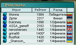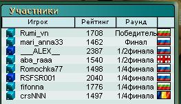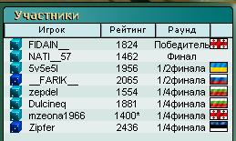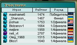1. Звание "Чемпион" разыгрывается в трёх дисциплинах: "НОКАУТ", "СВИНГ", "КОМБИНАЦИЯ" (СВИНГ+НОКАУТ). 2. Чтобы побороться за звание «ЧЕМПИОН» необходимо стабильно и успешно играть в турнирах "ЧЕМПИОН" в НОКАУТ или СВИНГ или том и другом. 3. Турниры "Чемпион" проводятся в будние дни (с понедельника по пятницу) в строго определенное время: НОКАУТ в 20-00, СВИНГ в 22-00. 4. Запись в турнир не ведётся; количество игроков неограниченно; в случае если количество игроков будет превышать один турнир,то будет проведен дополнительный турнир в след за первым (например: НОКАУТ 1-й турнир 20-00, второй 20-05; СВИНГ 22-00, 22-05). 5. Игрок в течение одного дня имеет право принять участие только в одном турнире "ЧЕМПИОН" СВИНГ и в одном турнире "ЧЕМПИОН" НОКАУТ. 6. По результатам турниров "ЧЕМПИОН" игрокам начисляются зачётные баллы: 6.1. НОКАУТ: +50 = победитель +25 = финалист +10 = полуфиналисты 6.2. СВИНГ: +50 = победитель +25 = 2-е место +15 = 3-е место +10 = 4-е место + 5 = 5-е место 6.3. Победителям турнира "ЧЕМПИОН" также фиксируются победы на общих основаниях. 7.1. Победителем в дисциплине "НОКАУТ" становится игрок, набравший большее количество баллов за отчетный месяц в турнирах "ЧЕМПИОН" НОКАУТ. 7.2. Победителем в дисциплине "СВИНГ" становится игрок, набравший большее количество баллов за отчетный месяц в турнирах "ЧЕМПИОН" СВИНГ. 7.3. Победителем в дисциплине "КОМБИНАЦИЯ" становится игрок, набравший большее количество баллов за отчетный месяц в турнирах "ЧЕМПИОН" НОКАУТ и СВИНГ. 8. Вся информация о результатах турниров, а также текущие и итоговые турнирные таблицы (которые обновляются еженедельно) будут находиться в этой теме. 9. Победителям будут вручены почетные грамоты и кубки. 10. Список победителей находится на главной странице сайта и ежемесячно пополняется. 11.КАТЕГОРИЧЕСКИ ЗАПРЕЩАЕТСЯ СЛИВАТЬ В ЭТИХ ТУРНИРАХ МАТЧИ! (ЕСЛИ НЕКОГДА,ТО ИСКЛЮЧЕНИЕ ПО ВРЕМЕНИ) ЕСЛИ НАРУШЕНЫ ПРАВИЛА ТО СЛЕДУЕТ НАКАЗАНИЕ СНЯТИЕ ВСЕХ ОЧКОВ ЗА МЕСЯЦ. !