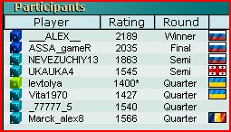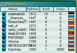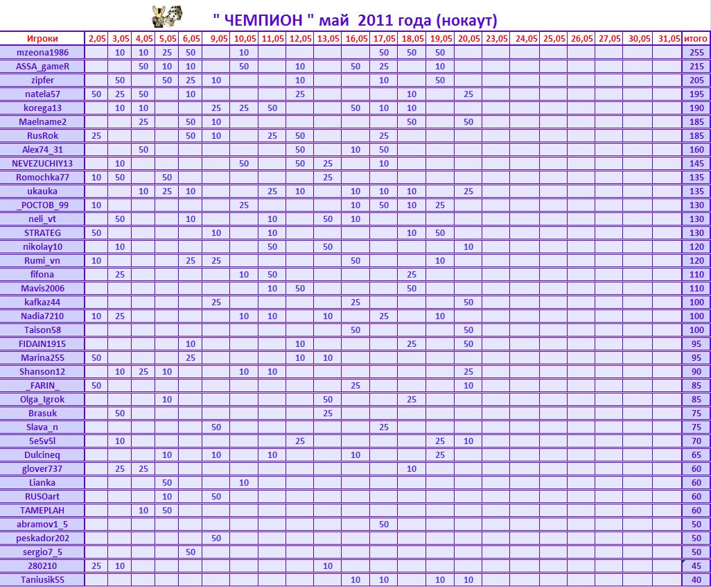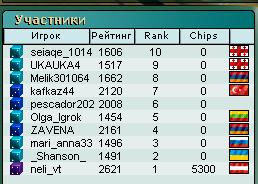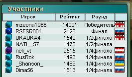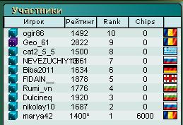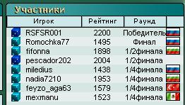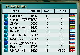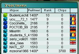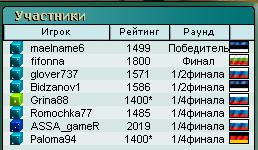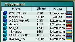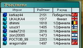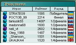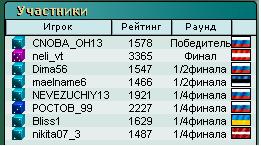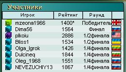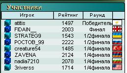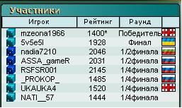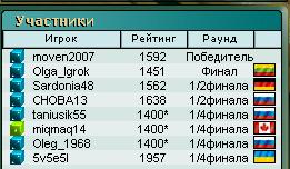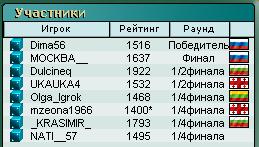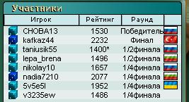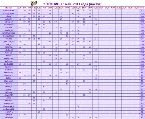 | natela57 играла в 2-х нокаутах-чемпион, Slava_N- играл в 2-х нокаутах - чемпион - НЕ ЗАЧЕТ!!! 17.05.2011г.ЧЕМПИОН НОКАУТ 20:00 17.05.2011Г. ЧЕМПИОН НОКАУТ 20:05 17.05.2011Г. ЧЕМПИОН НОКАУТ 20:10 17.05.2011Г.ЧЕМПИОН НОКАУТ 20:15