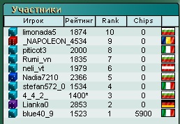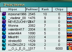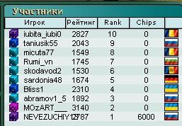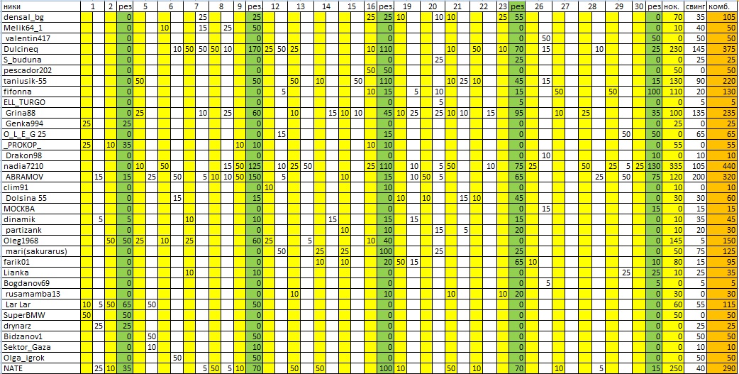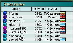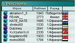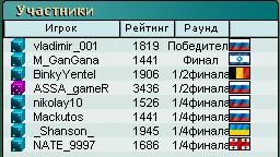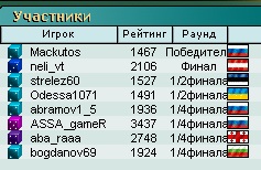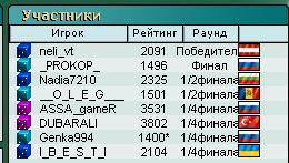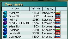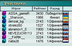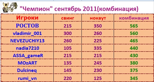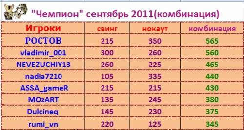 1. Звание "Чемпион" разыгрывается в трёх дисциплинах: "НОКАУТ", "СВИНГ", "КОМБИНАЦИЯ" (СВИНГ+НОКАУТ). 2. Чтобы побороться за звание «ЧЕМПИОН» необходимо стабильно и успешно играть в турнирах "ЧЕМПИОН" в НОКАУТ или СВИНГ или том и другом. 3. Турниры "Чемпион" проводятся в будние дни (с понедельника по пятницу) в строго определенное время: НОКАУТ в 20-00, СВИНГ в 22-00. 4. Запись в турнир не ведётся; количество игроков неограниченно; в случае если количество игроков будет превышать один турнир,то будет проведен дополнительный турнир в след за первым (например: НОКАУТ 1-й турнир 20-00, второй 20-05; СВИНГ 22-00, 22-05). 5. Игрок в течение одного дня имеет право принять участие только в одном турнире "ЧЕМПИОН" СВИНГ и в одном турнире "ЧЕМПИОН" НОКАУТ. 6. По результатам турниров "ЧЕМПИОН" игрокам начисляются зачётные баллы: 6.1. НОКАУТ: +50 = победитель +25 = финалист +10 = полуфиналисты 6.2. СВИНГ: +50 = победитель +25 = 2-е место +15 = 3-е место +10 = 4-е место + 5 = 5-е место 6.3. Победителям турнира "ЧЕМПИОН" также фиксируются победы на общих основаниях. 7.1. Победителем в дисциплине "НОКАУТ" становится игрок, набравший большее количество баллов за отчетный месяц в турнирах "ЧЕМПИОН" НОКАУТ. 7.2. Победителем в дисциплине "СВИНГ" становится игрок, набравший большее количество баллов за отчетный месяц в турнирах "ЧЕМПИОН" СВИНГ. 7.3. Победителем в дисциплине "КОМБИНАЦИЯ" становится игрок, набравший большее количество баллов за отчетный месяц в турнирах "ЧЕМПИОН" НОКАУТ и СВИНГ. 8. Вся информация о результатах турниров, а также текущие и итоговые турнирные таблицы (которые обновляются еженедельно) будут находиться в этой теме. 9. Победителям будут вручены почетные грамоты и кубки. 10. Список победителей находится на главной странице сайта и ежемесячно пополняется. 11.КАТЕГОРИЧЕСКИ ЗАПРЕЩАЕТСЯ СЛИВАТЬ В ЭТИХ ТУРНИРАХ МАТЧИ! (ЕСЛИ НЕКОГДА,ТО ИСКЛЮЧЕНИЕ ПО ВРЕМЕНИ) ЕСЛИ НАРУШЕНЫ ПРАВИЛА ТО СЛЕДУЕТ НАКАЗАНИЕ СНЯТИЕ ВСЕХ ОЧКОВ ЗА МЕСЯЦ. !